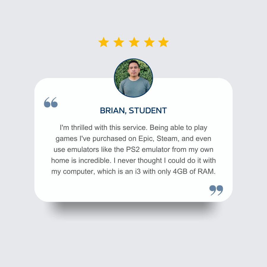 When you choose us, you’re not just selecting a run-of-the-mill remote gaming machine like those offered by Azure, Google Cloud Platform, or Amazon Web Services. You’re opting for our Gaming Station model, a fully configured and ready-to-use setup with professional software included. No more worries about extra setup costs or underused monthly licenses. We’ve taken care of everything for you. Get access to a dedicated gaming machine and a Windows-based computer, allowing you to install work tools and enjoy unrestricted browsing on high-speed internet. We handle software acquisition, though you can request specific software, and we’ll strive to make it available in our service for you.